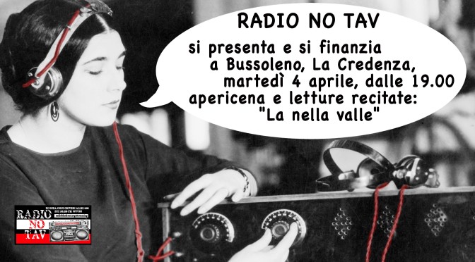 Martedì 4 aprile presso La Credenza di Bussoleno dalle ore 19.00, RADIO NOTAV si presenta agli ascoltatori con un aperitivo di finanziamento. Accompagneranno il buffet preparato dai redattori le letture recitate tratte da “La nella valle” di Sandro Moiso.